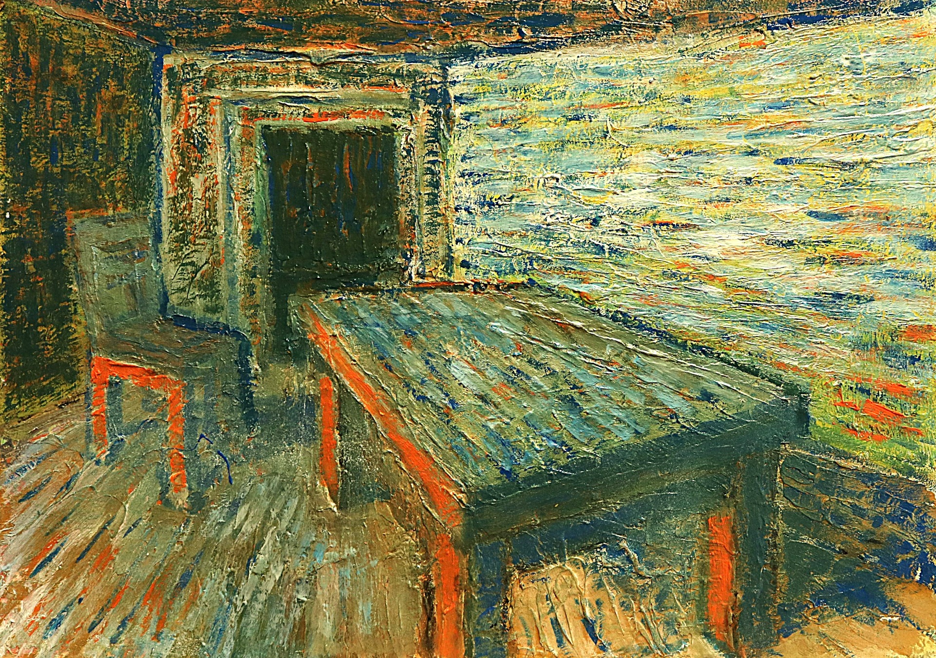 IS IT A ROOM? NO, IT'S A SCREAM OF LIGHT, A CHROMATIC PULSE THAT NEVER FADES. THE WALLS DON'T STAND STILL, THEY VIBRATE, LIKE TRIBAL DRUMS THAT SCREAM. THE BLUE ISN'T JUST BLUE—IT'S A STORMY OCEAN, THE GREEN IS A JUNGLE THAT ROARS AND PROTESTS. THE YELLOW? A SUN THAT LAUGHS BRAZENLY, WHILE THE RED IS FIRE, WILD AND BRAZEN. THE CHAIR DOESN'T WAIT, IT PAWS THE GROUND, IT QUIVERS, THE TABLE IS A STAGE FOR A THOUSAND POEMS. EVERY BRUSHSTROKE IS A DRAMATIC TWIST, AN EXPLOSION THAT BREAKS EVERY CHAIN. THE DOOR AT THE BACK? A SPATIAL PORTAL, SUCKING TIME INTO AN ASTRAL VORTEX. THERE IS NO STILLNESS, NO PAUSE, ONLY ENERGY THAT VIBRATES AND MARRIES